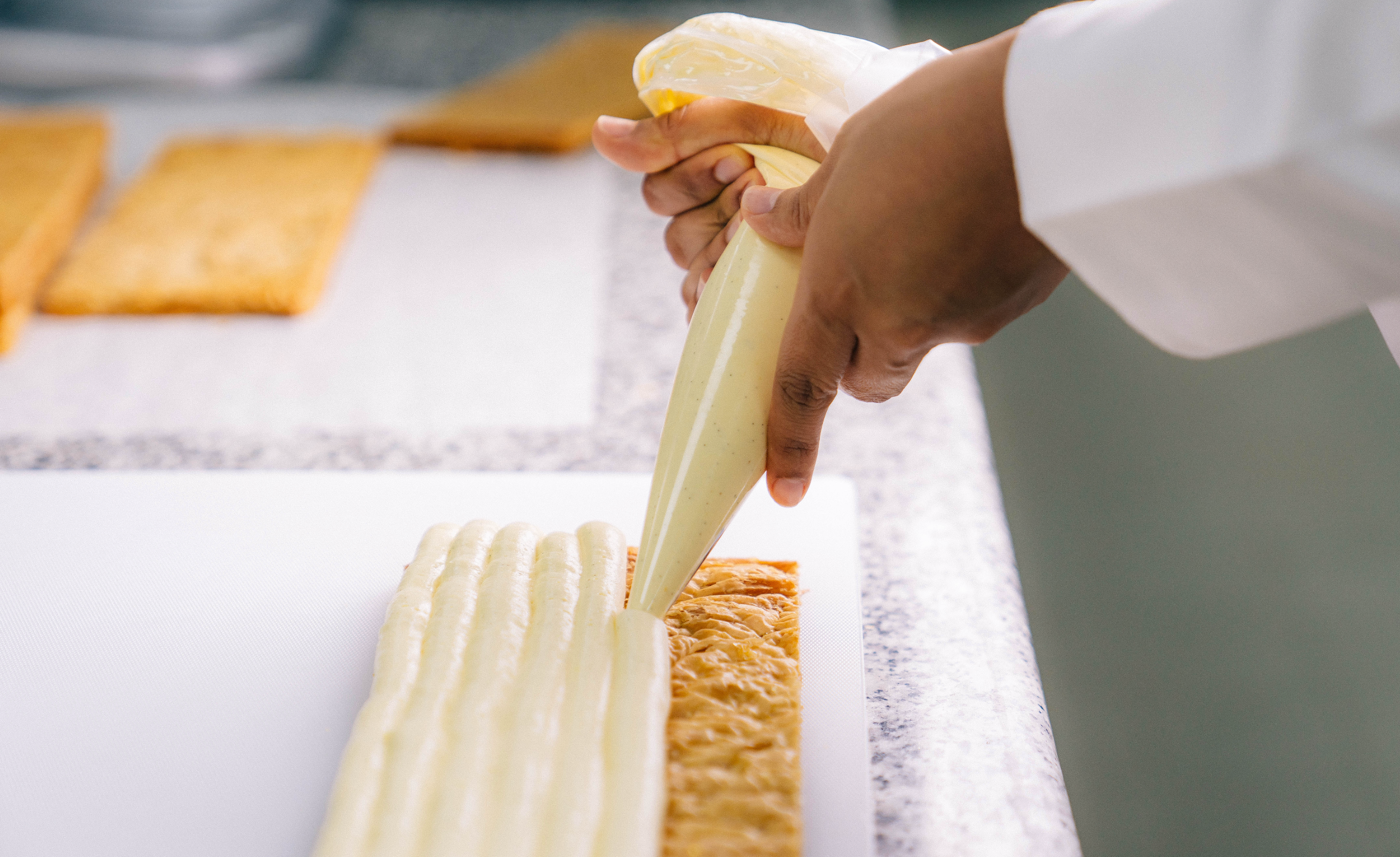 À Maison Frédéric Cassel Rabat, le Labo est un lieu de mesure et de lumière. Ici, la matière se prépare, le temps s’organise, le geste s’affine. Entremets, macarons, viennoiseries et pièces traiteur naissent chaque matin d’une même exigence : fraîcheur, tenue, plaisir.